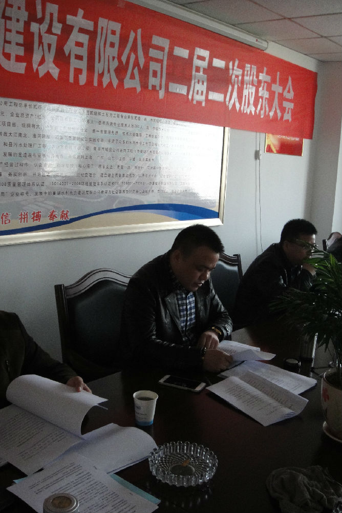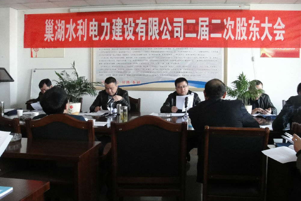 巢湖水利電力建設有限公司二屆二次年度股東大會,于2015年3月28日9時在公司會議室召開,會議由宋國華同志主持。會議主要議程,先主持人宣布到會人數和相關事項,其次,由董事長宋國華、監事曾勛德、財務部部長王平分別作2014年度董事會工作報告、2014年度監事工作報告和2014年度財務工作報告。會議其他事項是就股東提出的意見和建議,在大會上討論、表決。