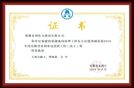 巢湖兆河治理工程東大圩進(jìn)洪閘榮獲“禹王獎”