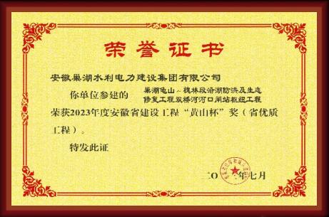 巢湖龜山~槐林段沿湖防洪及生態(tài)修復(fù)工程雙橋河河口閘站樞紐工程榮獲“黃山杯”獎(jiǎng)( 省優(yōu)質(zhì)工程 )