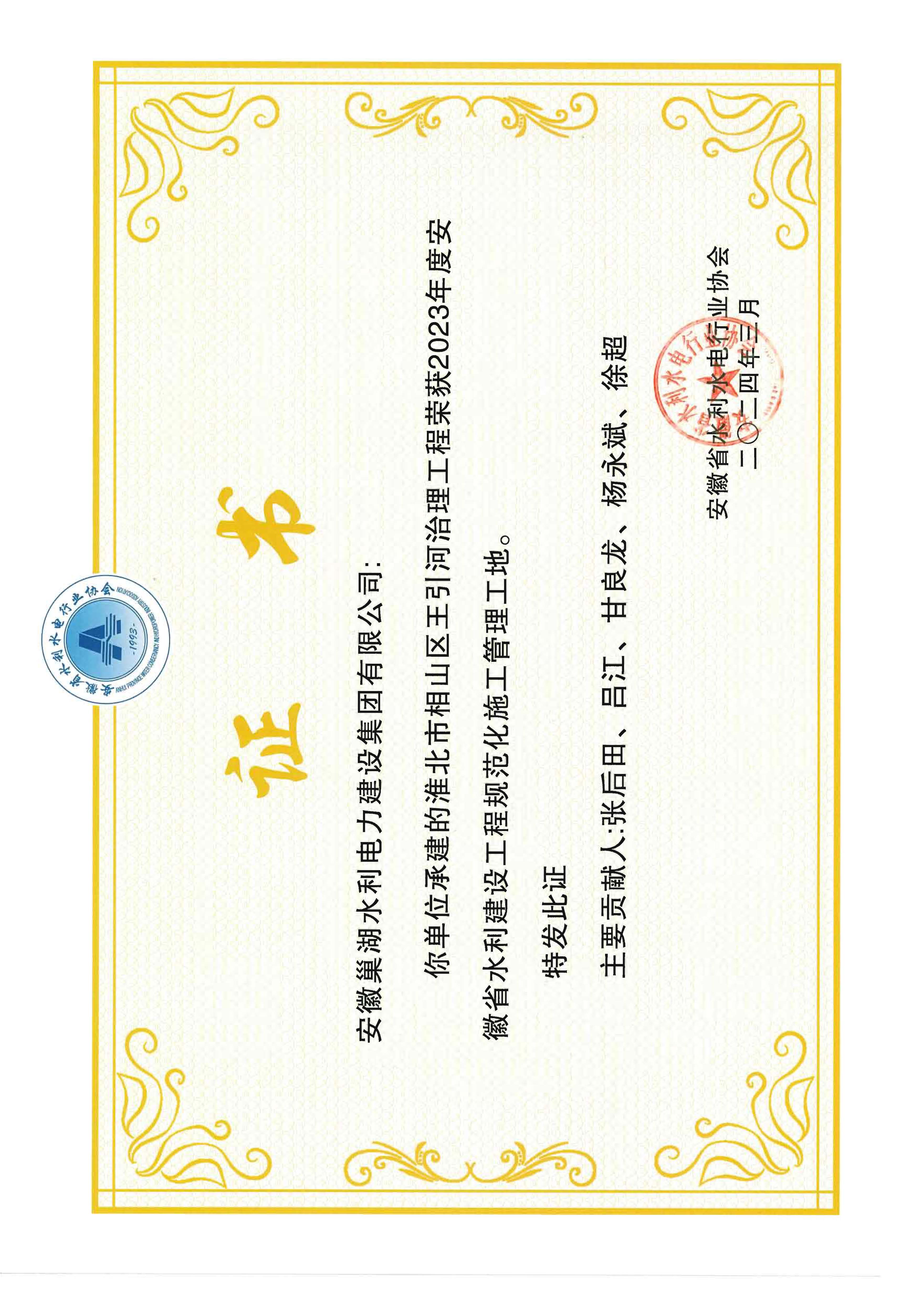 2023年度安徽省水利建設(shè)工程規(guī)范化施工管理工地獲獎證書