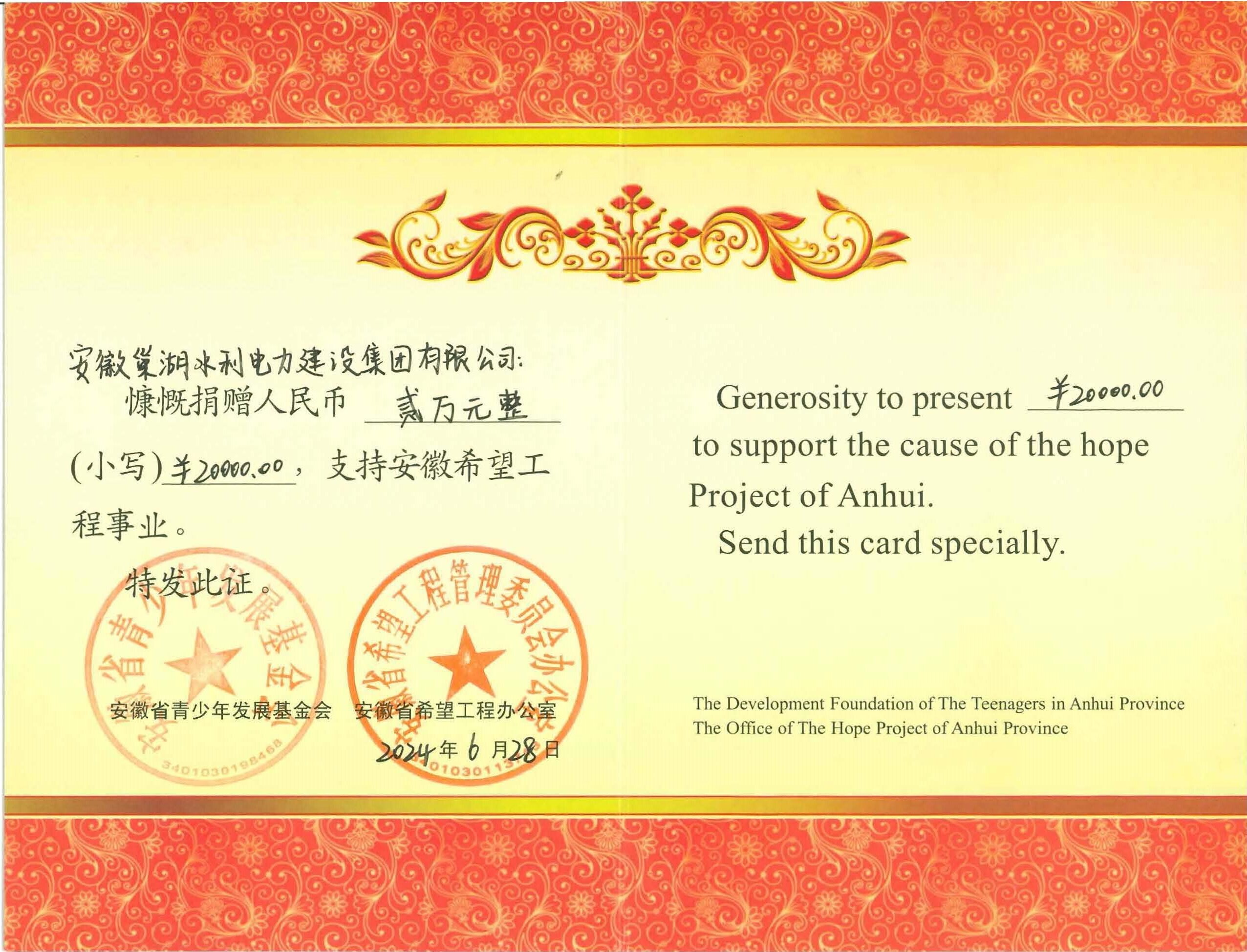 2024年6月28日安徽巢湖水利電力建設集團有限公司捐贈2萬元支持安徽希望工程事業,以實際行動彰顯了企業的社會責任與擔當。我們深信在黨和政府的堅強指引,社會各界的齊心協力下,災情無情人有情,克服困難必將迎來更加美好的明天。